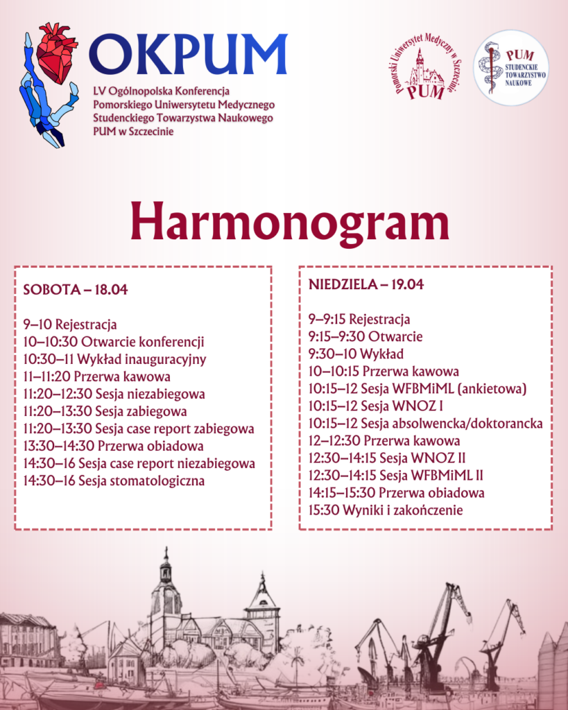 Welcome to the 55th National Conference of the SSS PMU in Szczecin (17–19.04.2026). Registration and abstract submission are open until 28.03.2026, 11:59 PM. One participant may submit up to 3 abstracts, with a limit of 4 authors per work. The conference fee is PLN 120 per presented work, and the payment deadline is 7.04.2026. Details regarding the conference fee can be found in the OKPUM Regulations. Submitting the form constitutes acceptance of the regulations.