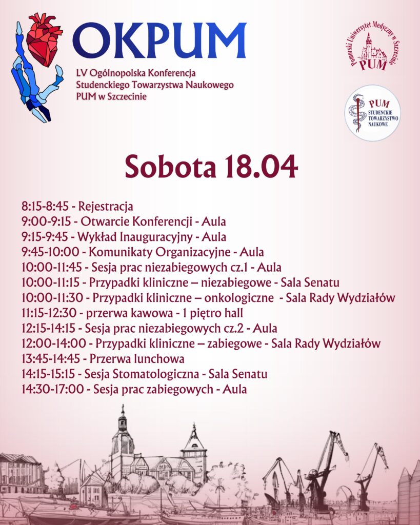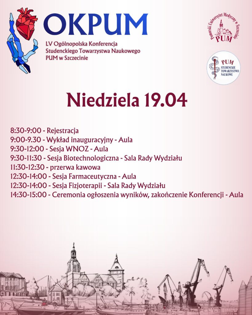 Zapraszamy do udziału w LV Ogólnopolskiej Konferencji STN PUM w Szczecinie (17–19.04.2026 r.). Rejestracja oraz nadsyłanie streszczeń możliwe są wyłącznie do 28.03.2026 r. do godz. 23:59. Każdy uczestnik aktywny może zgłosić do 3 prac, a liczba autorów jednej pracy wynosi maksymalnie 4 osoby. Opłata konferencyjna wynosi 120 PLN za każdą prezentowaną pracę, a termin jej uiszczenia upływa 7.04.2026 r. Szczegóły dotyczące opłaty konferencyjnej znajdują się w Regulaminie OKPUM. Przesłanie zgłoszenia jest równoznaczne z akceptacją regulaminu.